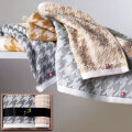 滑らかなテクスチャ―と、心躍るモダンデザイン。 英国生まれの世界中で好まれるお洒落な千鳥格子をモチーフに、代表色のチャコールグレー・キャメルで今治タオルに仕立ててみました。