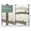 大人のグレージュカラーでシックな空間を演出。 高級感のあるグレーとあたたかみのあるベージュを混ぜ合わせた、グレージュカラーのタオルセット。甘撚りの糸で織り上げ、ふんわりとした肌触りです。長い歴史の中で培われた今治のジャガード織で、ゆったりとしたオーナメント柄を繊細な曲線美で表現。優しいグラデーションにも、糸染めの業が光ります。