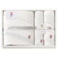 お肌になじみ、水分をしっかり吸収してくれるのでとても使いやすく贈り物に最適です。金糸・銀糸を使うことでさりげない豪華さと気品をそなえています。タオルの名産地「今治」から純白のタオルに気品をのせて。