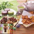 【内容】羊かん(抹茶・練り・小倉)(各60g)・かりんとう(蜂蜜黒糖・落花生)(各40g)・あられ(海老・海苔)(各12g)×各1
