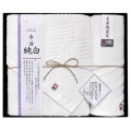今治 純白:大正からの日本ジャガード紋織の産地である今治。今治タオルの原点純白を基本に丁寧に晒したタオルは吸水性も良く丈夫でしっかりと仕上げております。蒼社川の名水と伝統の技が育んだ、ふっくらと心地よいタオルです。 無蛍光晒し:タオルを晒す工程で蛍光増白剤の使用を無くし素材本来の自然な白さを実現しました。